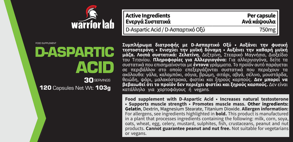 Ανάμεσα σε άλλες λειτουργίες (δύναμη, αυξημένη λίμπιντο κτλ) το D-Aspartic Acid της WarriorLab αυξάνει την ισχύ των μυϊκών συσπάσεων, βοηθάει τις αρτηρίες και άλλους μύες να χαλαρώνουν και να ηρεμούν, αυξάνει την έκκριση ινσουλίνης και την λιποδιάλυση. Με άλλα λόγια κάνει τις προπονήσεις ευκολότερες ενώ βοηθάει στην καύση του σωματικού λίπους.