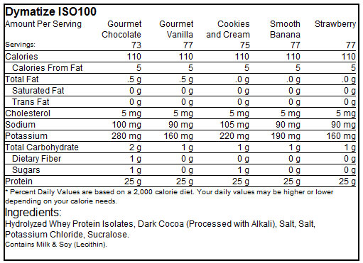 Η “ISO 100” της Dymatize, βρίσκεται στη κορυφή των συμπληρωμάτων πρωτεΐνης, ξεχωρίζoντας από τον ανταγωνισμό για την ποιότητα και την καθαρότητά της. Η περιεκτικότητά της σε πρωτεΐνη ορού γάλακτος είναι πολύ υψηλή, ενώ έχει μόνο 0,1 γρ. λίπους ανά δόση και μόλις 0,5 γρ. σακχάρων. Δε σταματά μόνο εδώ: Το 100% της πρωτεΐνης που περιέχει αποτελείται από απομονωμένη, υδρολυμένη, πρωτεΐνη ορού γάλακτος (100% Hydrolysed whey isolate). Η συγκεκριμένη ποιότητα πρωτεΐνης είναι η καλύτερα επεξεργασμένη και απορροφήσιμη από τον άνθρωπο. Είναι επίσης και η ακριβότερη στην παρασκευή της, γι’ αυτό και δεν απαντάται σε αυτό το ποσοστό παρά σε ελάχιστα και πολύ ακριβά μέχρι τώρα σκευάσματα της αγοράς.